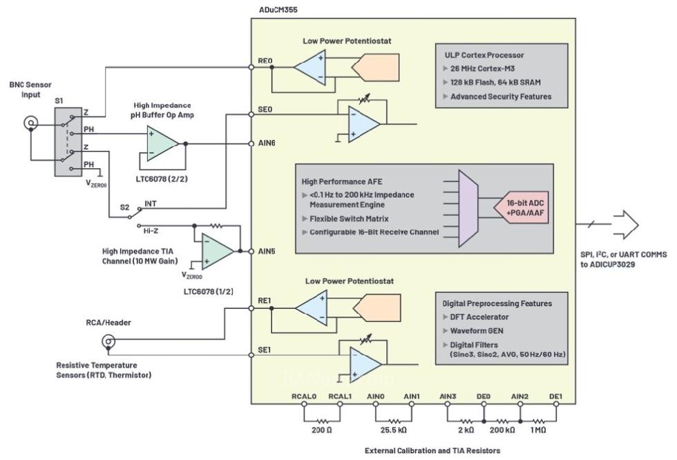 這是業(yè)界高度集成的先進化學傳感器測量前端,它為pH值測量提供了一個平臺解決方案,并且將所有必要的測量功能與低功耗微處理器相集成。ADuCM355是一款低功耗測量平臺,尺寸很小,足以集成在傳感器外殼內(nèi),而功能和性能堪比臺式儀器。圖4顯示了ADuCM355的pH值測量板,其中的BNC和RCA連接器用于連接pH探針和溫度傳感器。該測量板來自CN-0428 參考設計,更多相關詳情見圖5。