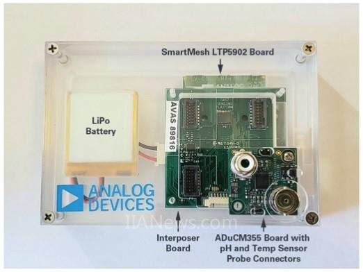 通過將ADuCM355和ADI SmartMesh收發(fā)器相結(jié)合,我們創(chuàng)建了一個小型低功耗pH值測量傳感器節(jié)點。ADuCM355將測得的pH數(shù)據(jù)作為數(shù)字輸出。然后,該數(shù)字數(shù)據(jù)通過UART連接到ADI的LTP5902 SmartMesh IP無線收發(fā)器。 LTP5902 通過SmartMesh網(wǎng)絡將數(shù)字數(shù)據(jù)傳輸至SmartMesh IP管理器。