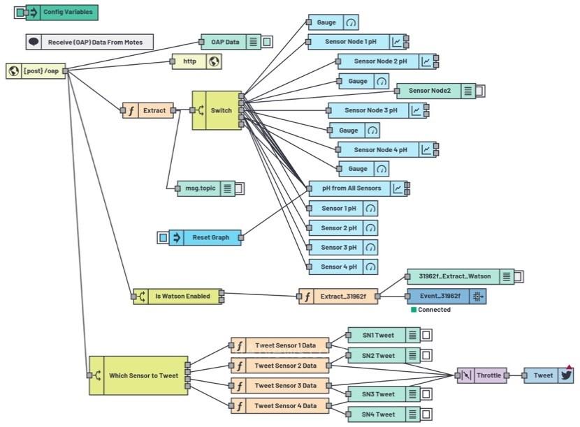 ● 此系統(tǒng)中的網(wǎng)關由PC執(zhí)行。該PC安裝了Node-Red和SmartMesh SDK。 SmartMesh SDK用于創(chuàng)建JavaScript object notation (JSON)服務器以存儲該數(shù)據(jù),JSON服務器連接到Node-RED。Node-RED用于顯示從每個傳感器節(jié)點測得的pH數(shù)據(jù),并允許連接到IBM Watson、Amazon AWS等云服務。