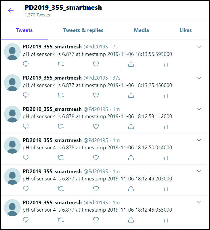 出于演示目的,我們使用的是錯列三格魚缸,水從頂格流到后面每格。每格中都插入一個pH傳感器探針。我們在遠處參考溶液中放置了第四個探針(圖9未顯示),以表示SmartMesh遠程無線通信。當我們改變頂格中溶液的pH值時,Node-RED上的數(shù)據(jù)隨之更新,顯示新的pH值。由于新的pH溶液從頂格流到后面每格,其他兩個pH傳感器也會更新其測量值,屏幕上顯示其數(shù)據(jù)。由于第四個傳感器位于pH值沒有變化的參考溶液中,因此該傳感器的讀數(shù)不變。以下各節(jié)提供了有關Node-RED和測得數(shù)據(jù)的更多信息。您也可以在此處查看演示記錄。