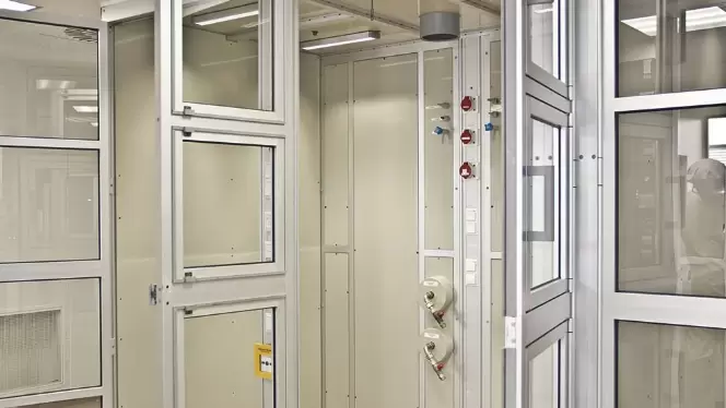 用于制造藥物活性成分的工作間,使用了內部插頭以及可以從外部控制的電燈開關,都安裝在工作間背板的安裝柱上。