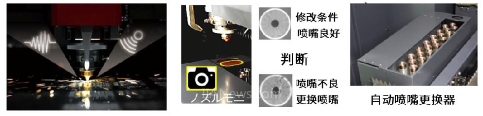 G-FX系列加工機的AI助手利用聲光傳感器及影像識別技術(shù)配合自動噴嘴更換器,將加工品質(zhì)不良的發(fā)現(xiàn)、噴嘴檢測及判斷乃至更換、在加工不良位置恢復(fù)并繼續(xù)加工等這一系列的工作在最短時間內(nèi)全部自動完成,且判斷出非噴嘴不良則自動調(diào)整加工條件等,都能給予自動應(yīng)對,真正達到了“不停頓高效”且無需任何人工干預(yù)連續(xù)加工的目的。