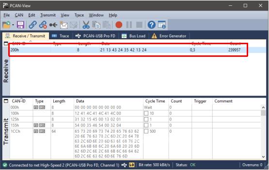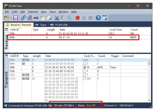 同一個網(wǎng)絡的各節(jié)點波特率應保持一致。如果不一致,則節(jié)點會進入bus off的錯誤狀態(tài),并會影響其他節(jié)點通訊;這時如果電腦端用的是PEAK的PCAN-View軟件,如下圖可以看到ID 300的報文Cycle Time不正常,下面的總線狀態(tài)也會顯示Bus-off。
