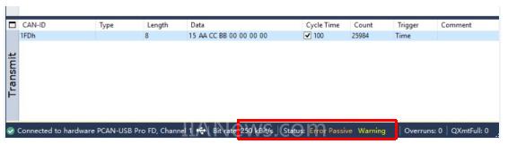 CAN 2.0 A/B網(wǎng)絡會將CAN FD報文報告為錯誤,因為CAN報文幀的結構發(fā)生了變化。CAN FD控制器則可以同時解析并傳輸CAN FD和傳統(tǒng)CAN報文。在PCAN-View在線監(jiān)控或者手持式PCAN-Diag FD設備可以看到這種Error Passive的顯示界面。