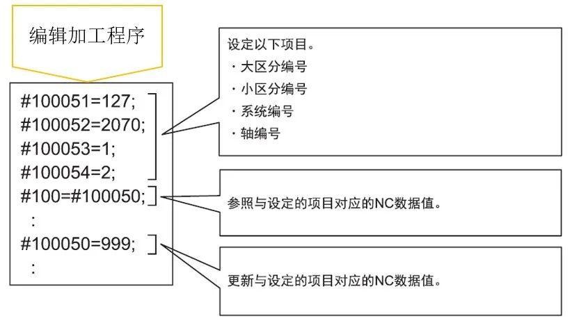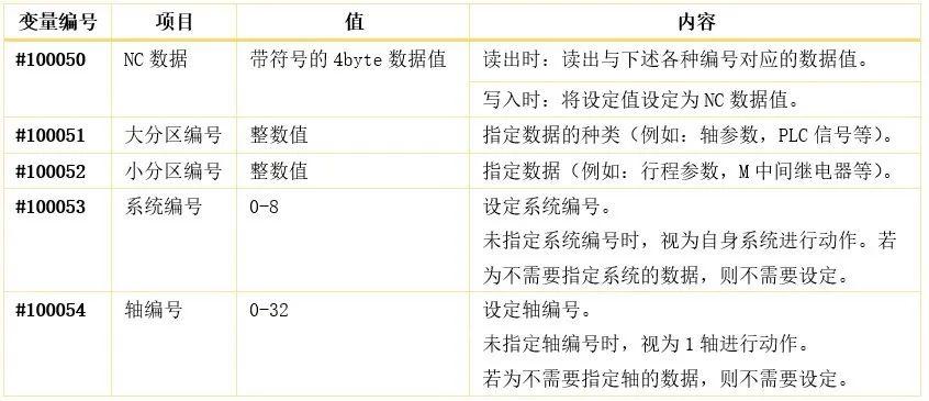 1.上述功能詳細(xì)說明請(qǐng)參考M800M80E80C80系列 編程說明書 M系_ib1501291chnh--23.31 系統(tǒng)變量(API 大小區(qū)分指定中的NC 數(shù)據(jù)讀寫)章節(jié)。