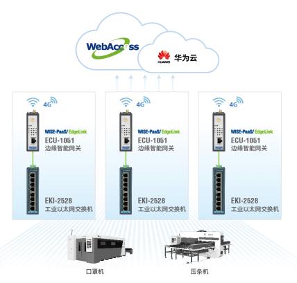 在具體實(shí)施過程中,研華將整個(gè)場(chǎng)景架構(gòu)分為兩層:底層是設(shè)備層,通過不同廠家的PLC實(shí)現(xiàn)邏輯控制。上面是采集層,研華物聯(lián)網(wǎng)邊緣智能網(wǎng)關(guān)ECU-1051TL通過內(nèi)置強(qiáng)大的驅(qū)動(dòng)協(xié)議,向下連接不同品牌的PLC設(shè)備,并采用4G形式傳輸數(shù)據(jù)至華為云,在云端進(jìn)行設(shè)備性能數(shù)據(jù)的實(shí)時(shí)跟蹤,對(duì)設(shè)備狀態(tài)管控及異常預(yù)警,實(shí)現(xiàn)設(shè)備的可視化管理。