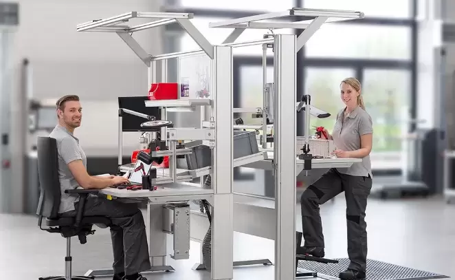 其次,item 的工作臺系統(tǒng)均可實現(xiàn)高度調(diào)節(jié),手動或電動不同配置可選。長期以來,裝配工作一直是一項比較枯燥的費時費力的坐姿操作過程,但是久坐不利于健康。德國脊背健康學會的專家建議,工作姿勢理想的比例是在 80% 的動態(tài)坐姿加上 20% 的站姿。
