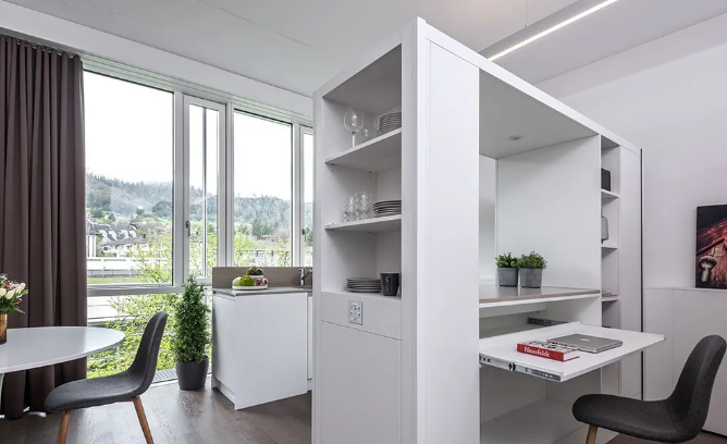 單個(gè)模塊只要按下按鈕就能移動(dòng),在更復(fù)雜的“高級(jí)”模型中,床、櫥柜和辦公室組成為模塊。在一天內(nèi)不同的時(shí)間段,不需要的模塊可以暫時(shí)挪到一旁,騰出更多需要的空間。