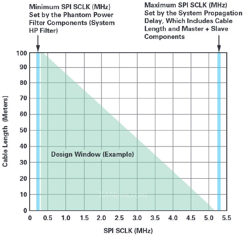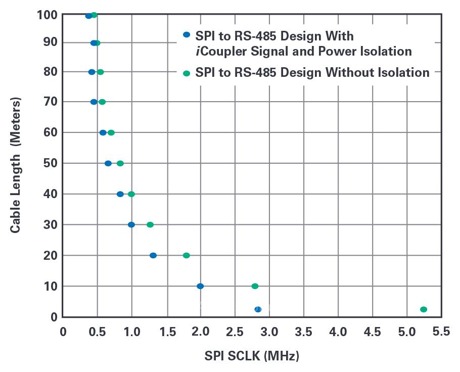 圖2.針對(duì)隔離和非隔離設(shè)計(jì)的SPI SCLK和電纜長(zhǎng)度指南。