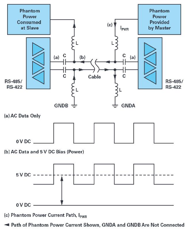 電源和數(shù)據(jù)通過(guò)電感電容網(wǎng)絡(luò)分布在單根雙絞線上,具體如圖3所示。高頻數(shù)據(jù)通過(guò)串聯(lián)電容與數(shù)據(jù)線路耦合,可以保護(hù)RS-485/RS-422收發(fā)器免受直流總線電壓影響,如圖3a所示。圖3所示為通過(guò)連接至數(shù)據(jù)線路的電感連接至主機(jī)控制器的電源。如圖3b所示,5V直流電源對(duì)交流數(shù)據(jù)總線實(shí)施偏置。在圖3c中,電流路徑顯示為從機(jī)和主機(jī)之間的IPWR,使用電纜遠(yuǎn)端基于狀態(tài)監(jiān)控(CbM)的從機(jī)傳感器節(jié)點(diǎn)上電感從線路中獲取電源。