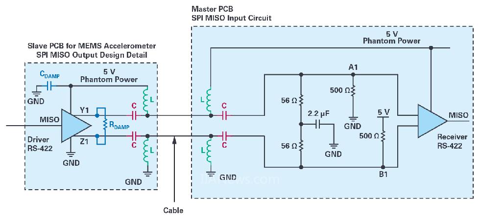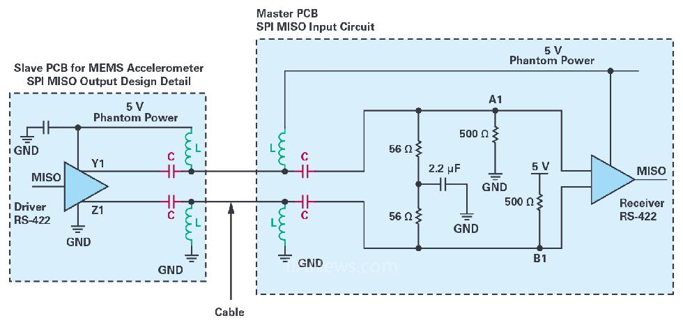在本文中,假設(shè)將虛假電源電感電容網(wǎng)絡(luò)部署到兩根電纜中,這會(huì)部署SPI MISO信號(hào)的RS-485/RS-422轉(zhuǎn)換。圖4描述主機(jī)和從機(jī)SPI至RS-485/RS-422的設(shè)計(jì),以及SPI MISO數(shù)據(jù)線的虛假電源濾波器電路。濾波器電路采用高通電纜,所以要求傳輸?shù)臄?shù)據(jù)信號(hào)不能包含直流內(nèi)容或極低頻率的內(nèi)容。