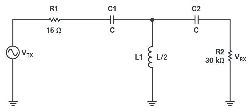 圖5所示為二階高通濾波器電路,這是對(duì)圖4的簡(jiǎn)化演示。RS-485/RS-422發(fā)射器的電壓輸出標(biāo)記為VTX,R1具備15Ω輸出電阻。R2為30 kΩ,是RS-485/RS-422接收器的標(biāo)準(zhǔn)輸入電阻。電感(L)和電容(C)值可以選擇,以匹配所需的系統(tǒng)數(shù)據(jù)速率。