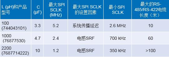 此電感不會(huì)給交流數(shù)據(jù)造成高于其SRF的高阻抗,在達(dá)到某個(gè)點(diǎn)之后,會(huì)開(kāi)始呈現(xiàn)電容性阻抗特性。選擇的電感SRF會(huì)限制在SPI至RS-485/RS-422物理層上使用的最大SPI SCLK,如圖1所示。在長(zhǎng)電纜上使用時(shí),可能不會(huì)接觸到SRF電感;例如,電纜超過(guò)10米時(shí),可能無(wú)法達(dá)到11 MHz SPI SCLK速率(產(chǎn)品型號(hào)為744043101的SRF)。在其他情況下,在長(zhǎng)電纜上運(yùn)行時(shí),電感SRF可能達(dá)到更低的SPI SCLK速率(2.4 MHz、1.2 MHz)。如前所述,在虛假電源濾波器網(wǎng)絡(luò)中使用時(shí),電感也會(huì)限制可允許的最低SCLK速率。
