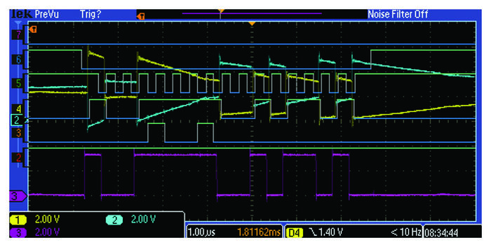 圖11和表4顯示在SPI主機(jī)和從機(jī)上,以及在RS-485/RS-422差分電壓總線上測(cè)量的電壓。這些電壓使用圖10中的示例應(yīng)用設(shè)置測(cè)量。模擬信號(hào)1(黃色)和2(藍(lán)色)是表示MISO信號(hào)(紫色)的總線壓差,在SPI從機(jī)輸出端測(cè)量。數(shù)字信號(hào)4(黃色)顯示在主機(jī)控制器上采樣的MISO。SPI主機(jī)上的MISO信號(hào)與SPI從機(jī)上的MISO的極性和相位匹配,且無(wú)傳播延遲。