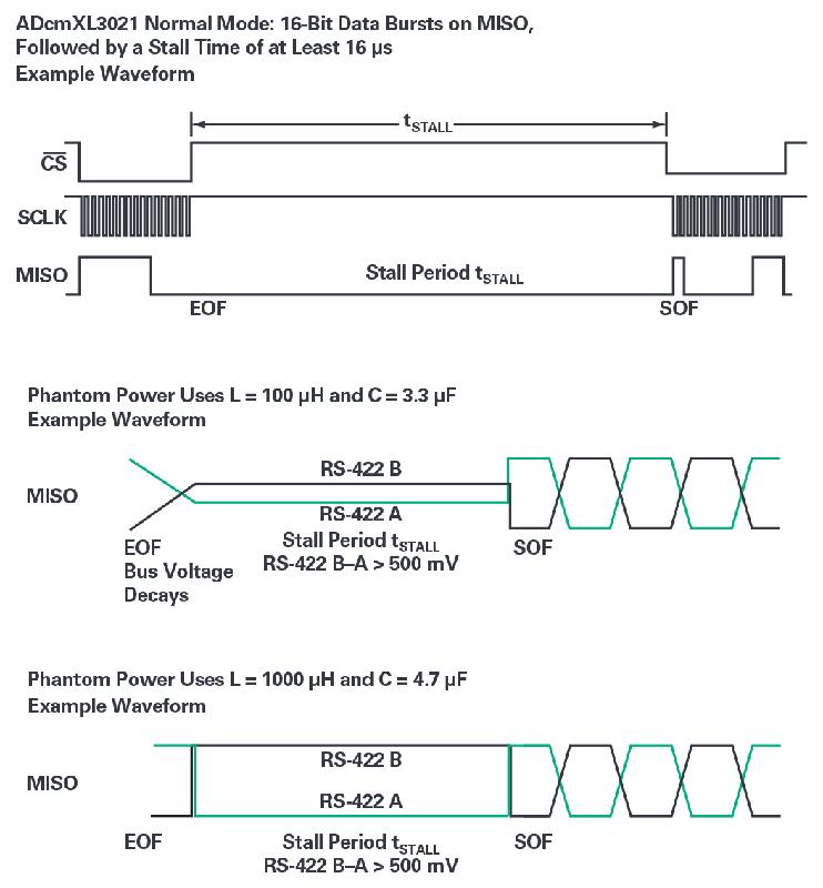 圖12表示ADcmXL3021正常模式,其中包括SPI協(xié)議,該協(xié)議在MISO上發(fā)送16位數(shù)據(jù)突波,之后空閑一段時(shí)間(最短16 μs),然后再發(fā)送另一個(gè)16位數(shù)據(jù)突波。