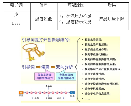 二,引導(dǎo)詞激發(fā)創(chuàng)新:結(jié)合常見參數(shù),通過引導(dǎo)詞找出偏離項,揭示事故劇情,即找出事故可能發(fā)生的場景,原因,危害以及后果。例如下例: