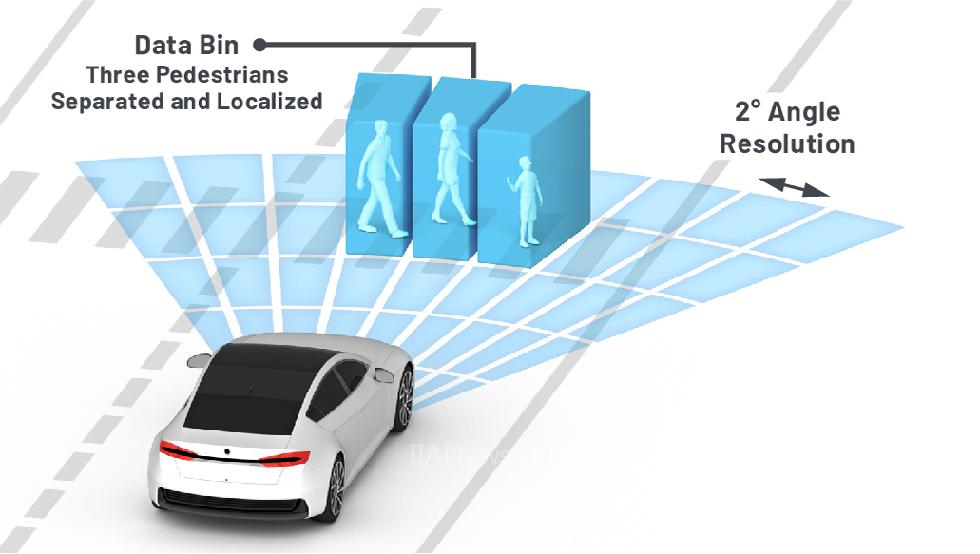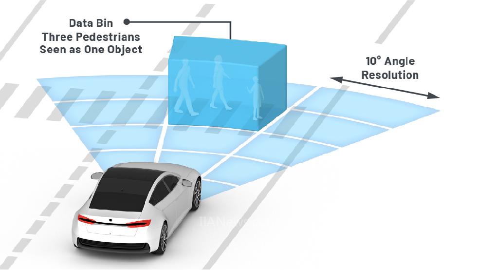 成像雷達(dá)的角度分辨率為1°至2°,是非成像雷達(dá)分辨率的10倍。數(shù)據(jù)箱收集1°到2°分辨率的信息,幫助區(qū)分和確定3名行人的位置。