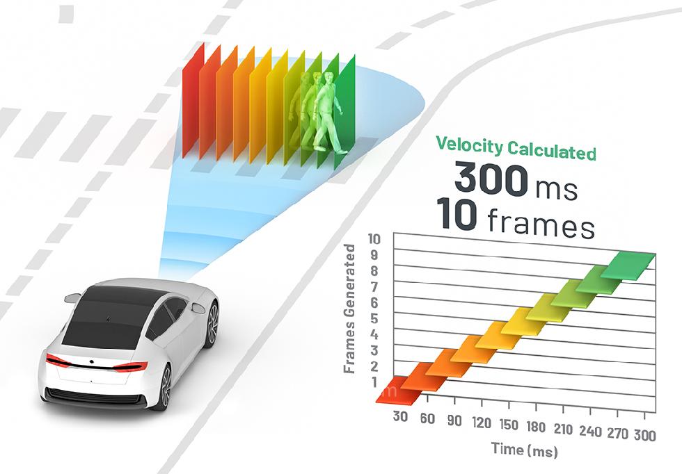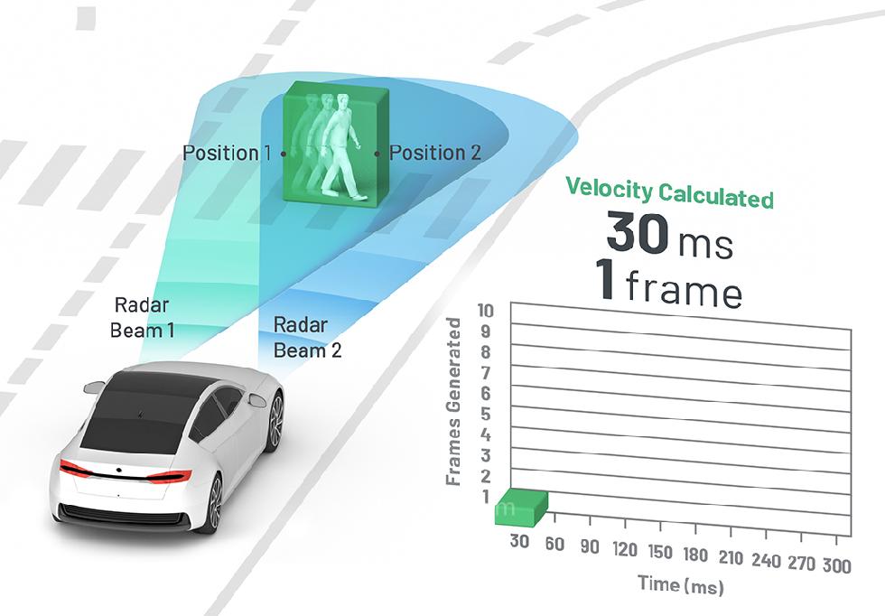 車(chē)輛成像系統(tǒng)的一個(gè)重點(diǎn)是能夠快速計(jì)算橫向速度,即物體正交(以直角)移動(dòng)到車(chē)輛行駛方向的速度。但是,要實(shí)現(xiàn)足夠低的誤報(bào)率,即使是主要基于攝像頭的出色機(jī)器學(xué)習(xí)算法仍然需要大約300 ms來(lái)進(jìn)行橫向移動(dòng)檢測(cè)。對(duì)于在以每小時(shí)60英里速度行駛的車(chē)輛前方行走的行人來(lái)說(shuō),毫秒之差就關(guān)系到人員受傷的輕重程度,因此響應(yīng)時(shí)間至關(guān)重要。