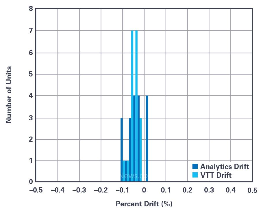 在第2階段,這些電表可以在加速環(huán)境中老化8個(gè)月,用于模擬電表在30°C平均環(huán)境溫度下使用大約10年的情形。第2階段在受控的實(shí)驗(yàn)室環(huán)境中進(jìn)行,而不是在現(xiàn)場進(jìn)行,以便準(zhǔn)確評(píng)估分析服務(wù)的性能,并加快這些電表的老化過程。與第1階段類似,跟蹤的這19臺(tái)設(shè)備的精度偏移優(yōu)于0.1%(如圖4所示),精度測(cè)試和分析服務(wù)均顯示平均負(fù)偏移約為–0.05%。