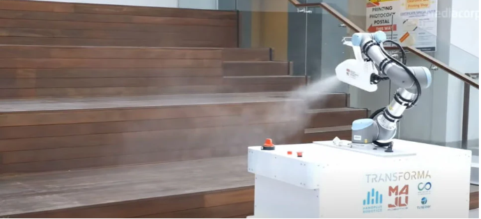 4月中旬,南洋理工大學(NTU)的研究人員為解決這一問題,推出了eXtremeDisinfectionroBOT(XDBOT),它由一個裝有靜電噴嘴的UR5協(xié)作式機器人組成,安裝在一個移動平臺上。