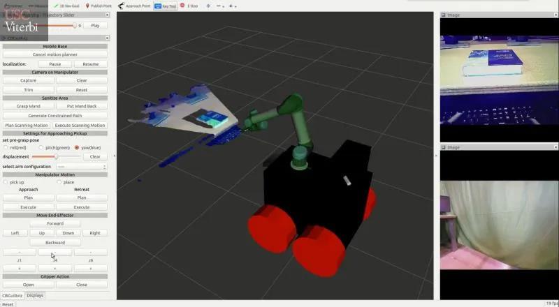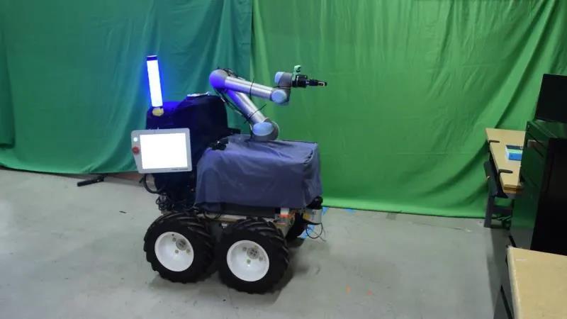 同樣在今年4月,南加利福尼亞大學(USC)的一個團隊公布了他們設計的敏捷式自主移動機器人(ADAMMS-UV)原型。它與XDBOT類似,使用的是安裝在移動平臺上的UR5協(xié)作式機器人。但ADAMMS-UV并非通過噴灑消毒劑的方式進行消毒,而是在底座上安裝了一個額外的紫外線光源,使用紫外線消毒棒進行消毒,通過紫外線破壞病毒的DNA。