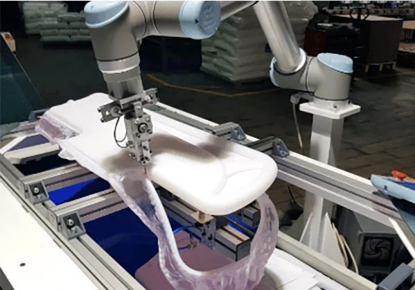 優(yōu)傲機器人正在切割醫(yī)院病床的吹塑組件