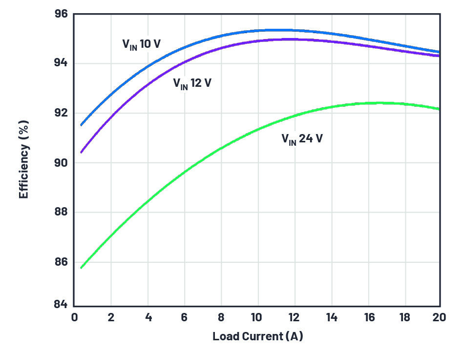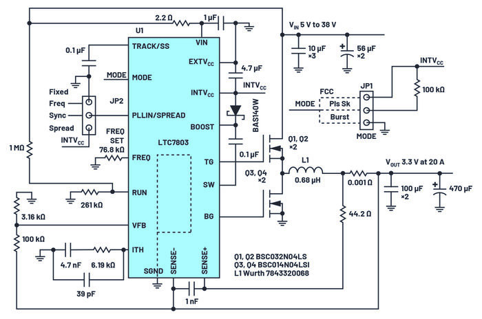 圖1.基于LTC7803的轉(zhuǎn)換器電氣原理圖,VIN為5 V至38 V,VOUT為3.3 V(20A時(shí))