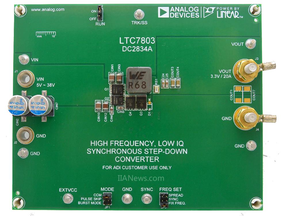 圖3所示的DC2834A演示板用于LTC7803評(píng)估。圖4顯示DC2834在滿載下的熱圖像。
