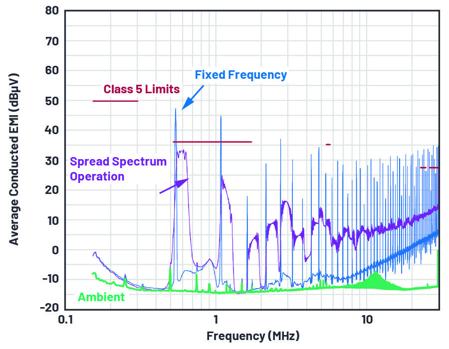 圖5.在CISPR 25 5類(lèi)限制下啟用和禁用擴(kuò)頻操作(固定頻率)的傳導(dǎo)EMI掃描結(jié)果