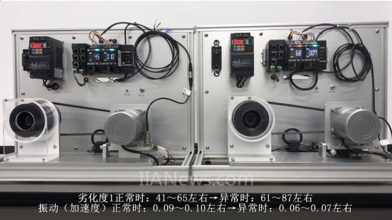打開電機電源后,可以發(fā)現(xiàn)左側(cè)馬達和風(fēng)扇位置無偏移的正常狀態(tài)下,劣化度1在41~65左右,振動(加速度)為0.09~0.10左右,劣化度2在85~95左右,振動(速度)為0.00~1.24左右;