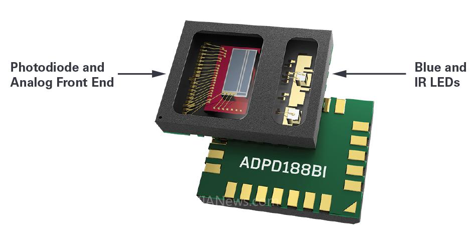 ADPD188BI煙霧探測(cè)模塊在3.8 mm × 5.0 mm × 0.9 mm小型封裝中集成了LED、光電二極管和一個(gè)模擬前端(AFE)。其優(yōu)勢(shì)包括: