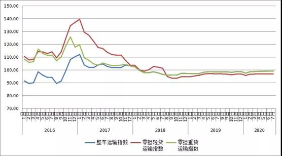 分車型指數(shù)看,各車型指數(shù)環(huán)比漲跌互現(xiàn),同比除零擔輕貨指數(shù)略低于去年同期,其他車型指數(shù)繼續(xù)保持小幅增長。以大宗商品及區(qū)域運輸為主的整車指數(shù)為99.0點,比上月回落0.05%,比上年同期回升0.6%。零擔指數(shù)中,零擔輕貨指數(shù)為96.8點,比上月回升0.02%,比上年同期回落0.05%;零擔重貨指數(shù)為99.0點,比上月回落0.01%,比上年同期回升0.6%。