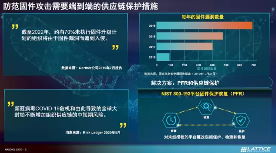 從去年開始,萊迪思就推出了多款針對固件保護的產(chǎn)品,此次在2020下半年發(fā)布的是該產(chǎn)品的第三代,謝征帆表示,無論是Sentry Solution Stack還出SupplyGuard 設(shè)計服務(wù)最終目的都是提供動態(tài)的信任,解決的痛點是固件攻擊。目前客戶用的大多是靜態(tài)被動的方案,不能提供全面的動態(tài)保護和恢復(fù),而SupplyGuard可以避免包括over building、克隆、木馬植入等攻擊的入侵,如果新冠疫情沒有緩解的話,很多的供應(yīng)鏈人工值守的難度會越來越大,屆時就需要采用動態(tài)、并行、實時、快速響應(yīng)的方案來管理這些問題,而萊迪思的Sentry Solution Stack由于符合NIST規(guī)范,加上RISC-V模塊提供的靈活性,實現(xiàn)了對硬件底層的動態(tài)監(jiān)控,并達到納秒級的響應(yīng)機制,是固件保護的不二選擇。結(jié)合SupplyGuard 就能夠在任何環(huán)境下實現(xiàn)最低成本的制造,抵御供應(yīng)鏈中各個環(huán)節(jié)的攻擊。