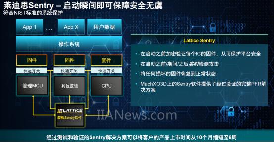 相比傳統(tǒng)的保護,萊迪思的方案在保護機制上有了很大改變。大多數(shù)硬件芯片都會有一個相應(yīng)的固件,由SPI Flash來對這些器件做上電以后的配置,而在此之上才是操作系統(tǒng)層的應(yīng)用程序?qū)?,而XO3D和Sentry的應(yīng)用方案相當于在芯片和固件之間增加了一層額外的保護。