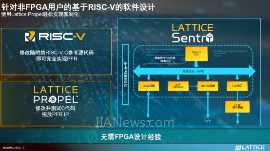 而萊迪思Sentry Solution Stack的保護主要基于萊迪思XO3D硬件。在硬件平臺之上有一系列的IP核,比如監(jiān)視器、 Mux和一些通用的接口,在此之上是軟件工具,除了FPGA開發(fā)軟件,萊迪思還提供了一個Lattice embedded CPU的開發(fā)平臺,也就是Propel平臺,并內(nèi)部包含一些參考設(shè)計。并且,萊迪思還提供了一些定制化服務(wù),針對廠商的需求做服務(wù)延伸。