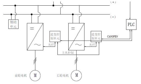 AGV的基本原理是由鋰電池組供電,整個(gè)車子由兩臺逆變器采用下垂控制共同驅(qū)動,一臺驅(qū)動前輪,另一臺驅(qū)動后輪。兩臺逆變器采用主從控制,主機(jī)采用速度控制,從機(jī)為轉(zhuǎn)矩控制,通過設(shè)定一定的下垂頻率,達(dá)到功率平衡。車上配置有PLC,PLC通過Canopen通訊控制GD800逆變器。