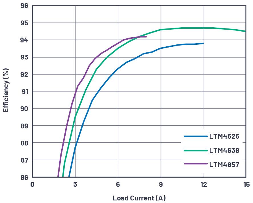 圖2.使用推薦的開(kāi)關(guān)頻率,VIN = 12 V、VOUT = 5 V時(shí),LTM4626、LTM4638和LTM4657的效率比較結(jié)果。