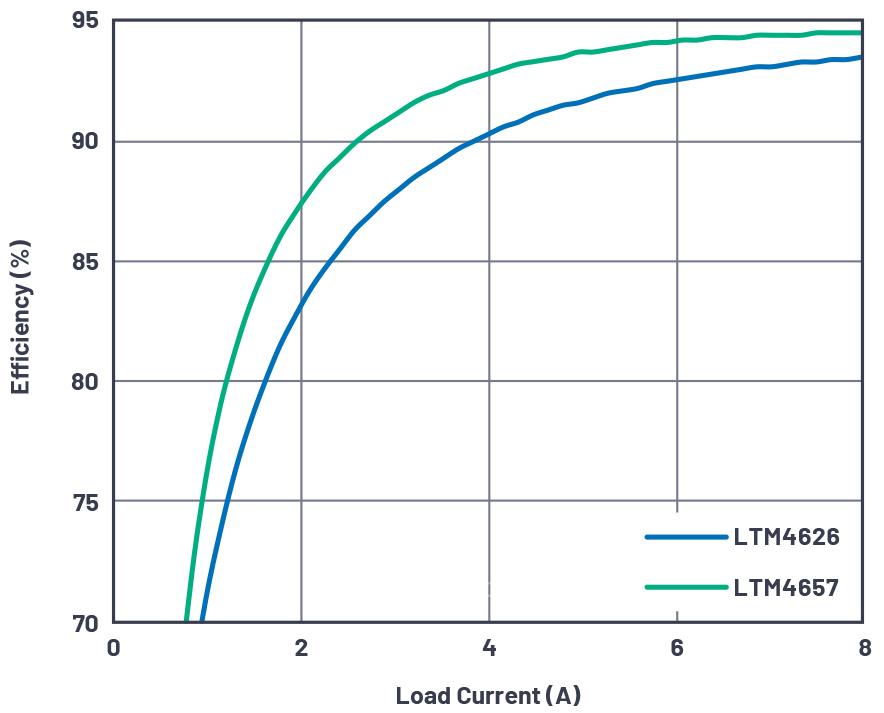 圖4.LTM4626和LTM4657在DC2989A演示板上采用相同配置,在1.25 MHz時(shí)的效率比較結(jié)果。