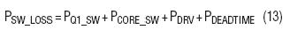 3.    其他交流相關(guān)損耗。其他交流相關(guān)損耗包括柵極驅(qū)動(dòng)器損耗PSW_GATE(等于VDRV ? QG ? fS)和死區(qū)時(shí)間(頂部FET Q1和底部FET Q2均關(guān)斷時(shí))體二極管傳導(dǎo)損耗(等于(ΔTON + ΔTOFF) ? VD(Q2) ? fS)。