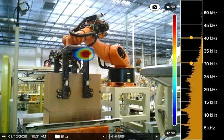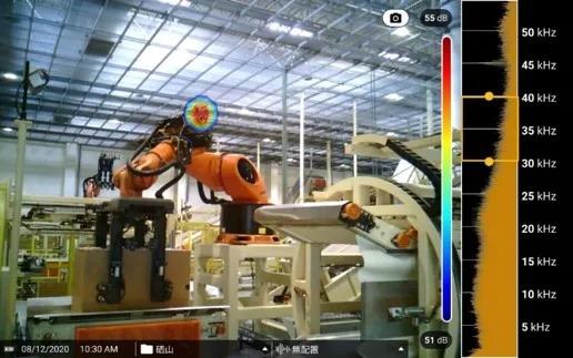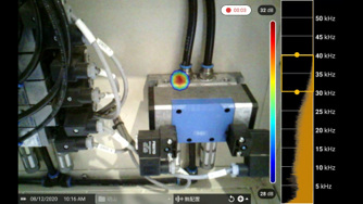 縮空氣泄漏時,在泄漏點(diǎn)因渦流會產(chǎn)生聲波/超聲波能量,這些能量通過空氣傳遞至聲學(xué)成像儀的聲壓傳感器陣列,在顯示屏上以可見光圖像為底、聲波/超聲波能量按照調(diào)色板顏色顯示的畫面,從圖像上即可快速對泄漏點(diǎn)進(jìn)行排查,并可將泄漏點(diǎn)以JEPG照片或MP4視頻格式進(jìn)行保存。