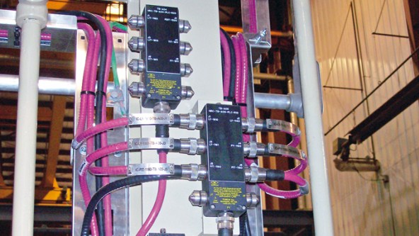 設(shè)計需要有考慮到大量的信號,還需要減少布線的空間,同時要保持百分之二十的客戶預留空間。一旦完成接線,在Enerflex 工廠PLC 開始編程和試運行開始,整個支架分解成更小的部分以便于運輸。這意味著,電纜從分線盒處斷開,在連接處安裝防護蓋以便于運輸。一旦當?shù)毓と酥?新組合,由于接插件的防誤差裝置,測試信號的過程時間很短。防誤差接插件意味著最低的失誤 率,進一步提高效率和減少現(xiàn)場費用。