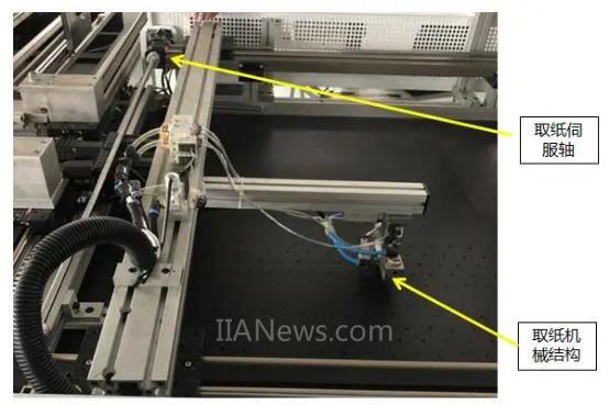 取紙工站功能:將噴膠完成的底紙抓取到輸送軸上。此處增加了吹氣閥和翹紙氣缸,避免取紙時將下方底紙一起帶動,影響下一次噴膠。