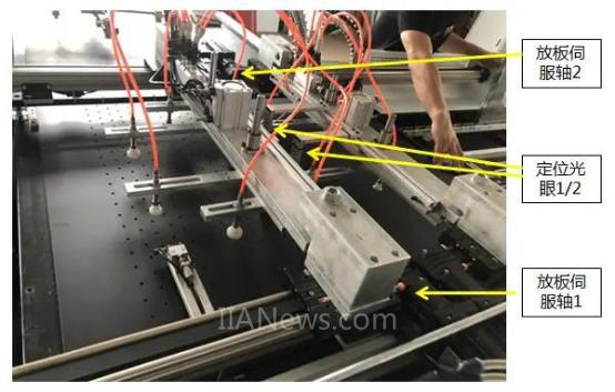 前后放板工站功能:放板伺服軸1與放板伺服軸2,兩顆伺服組成龍門帶放板機構前后動作。動作是光眼信號反饋給伺服,抓取反饋位置。抓取到的位置由CANOPEN通訊傳輸給PLC,PLC運算后,給兩個伺服軸不同的定位位置,使龍門能夠對齊來料的偏差。