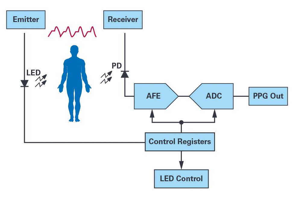 測(cè)量PPG采用兩種不同的原則。您可以讓光通過(guò)身體的某個(gè)部位,例如手指或耳垂,然后在反面測(cè)量接收到或未吸收的光量;或者,在身體的同一側(cè)發(fā)射光并測(cè)量反射的光量。與反射系統(tǒng)相比,測(cè)量通過(guò)人體的光量得出的信號(hào)量大約多出40 dB至60 dB;但是,采用反射系統(tǒng)時(shí),您可以隨意選擇放置傳感器的位置。
