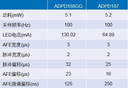 表1.ADPD188GG和典范產(chǎn)品ADPD107之間的光學(xué)模塊比較