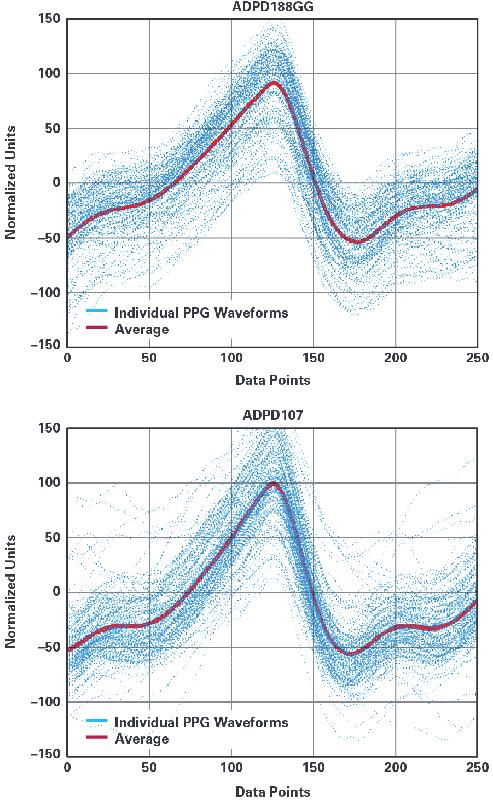 圖3.提取單獨(dú)的PPG波形(局部極大值周圍的±125數(shù)據(jù)點(diǎn)),并彼此重疊比較(藍(lán)色點(diǎn)線)。波形的總體平均值用紅線表示。上圖顯示了由ADPD188GG和ADPD107分立式解決方案記錄的PPG信號(hào)之間的相似性。