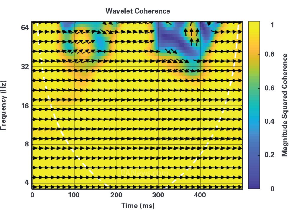 圖4.兩個(gè)接受比較的PPG信號(hào)的總體平均值之間的幅度方波相干性由時(shí)間域和頻率域中的顏色強(qiáng)度圖表示。箭頭方向與信號(hào)之間的相位差成正比。方向向右的水平信號(hào)表示信號(hào)之間不存在相位差。1