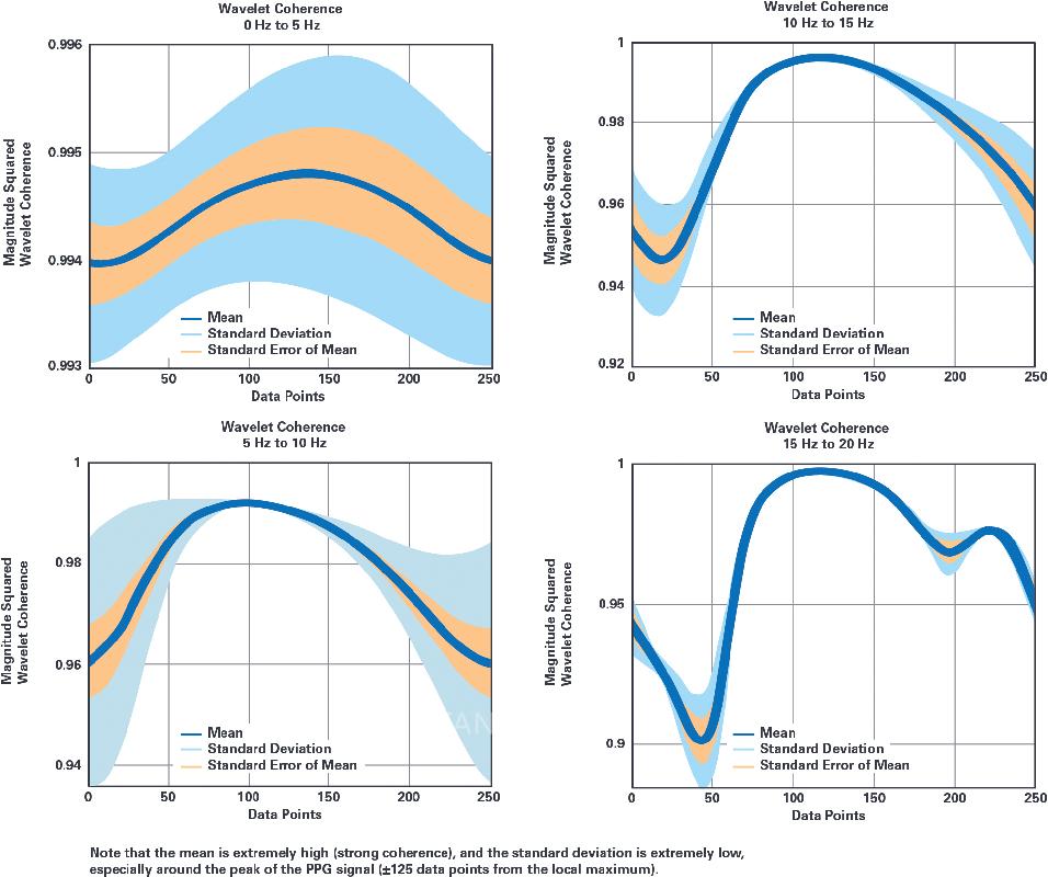 對(duì)于所有11位受試者,在PPG信號(hào)峰值周圍的所有頻段內(nèi),其相干性值都高于0.95,這表示,典范產(chǎn)品和新集成的ADPD188GG之間相似度非常高。
