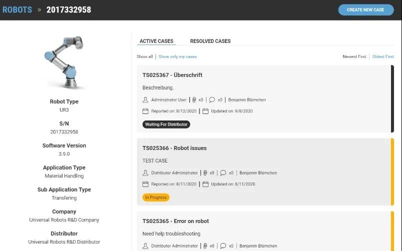 已購買service360服務(wù)的終端用戶也可用同樣的方法在MyUR平臺上管理機器人或新增案例。如此一來,終端用戶就可以直接向合作伙伴和優(yōu)傲技術(shù)支持中心提出案例,并保證在4小時內(nèi)得到響應(yīng)。