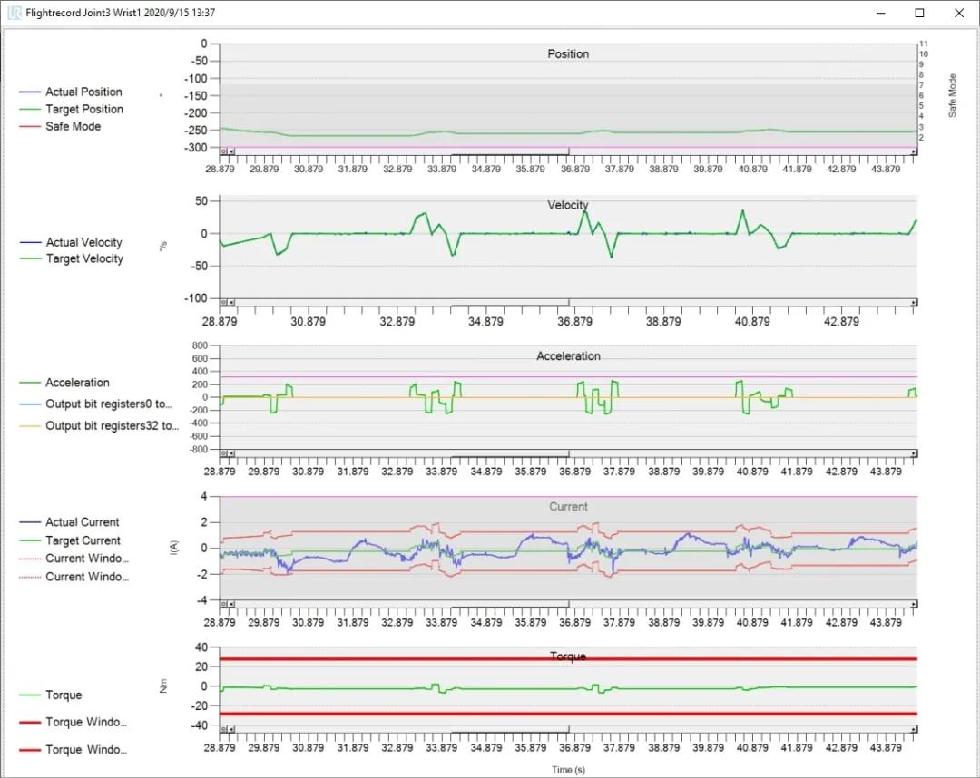 除了顯示日志信息外,新優(yōu)傲日志查看器(UR Log Viewer)還可提供關(guān)鍵日志事件摘要,并允許用戶查看計劃外停機時自動生成的(flight record files)。每個(flight record)都包含了保護性停機或故障發(fā)生前 30 秒捕獲的實時數(shù)據(jù)(包括關(guān)節(jié)位置、速度、加速度、電流、扭矩等)。該工具適用于 CB3 和 e 系列記錄。從現(xiàn)在起,我們的標準服務(wù)培訓(xùn)將涵蓋(UR Log Viewer)的使用。